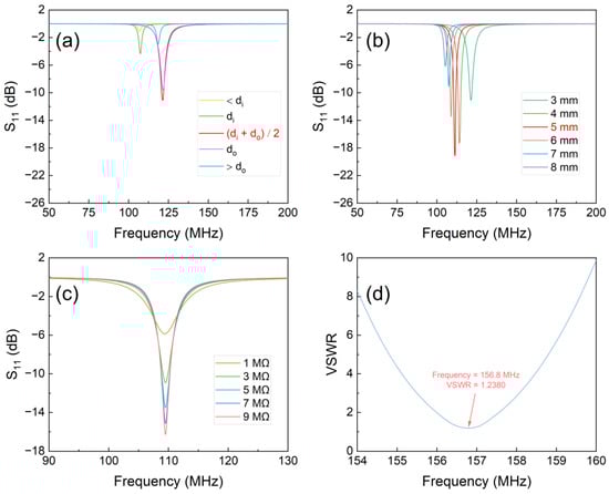 Firstly, the S11 parameters of the LC antenna are optimized by using the side length of the reader antenna. The side lengths of 0.8di, di, (di + do)/2, do, and 1.2do are selected for simulation using a square reader antenna. The simulation outcome of the parameter under various side lengths of the reader antenna (Figure 4a) demonstrates that, when the reader antenna is set to , has the smallest value of −11.1 dB. Subsequently, the S11 parameters were then optimized by means of optimizing the reading height of the reader antenna.