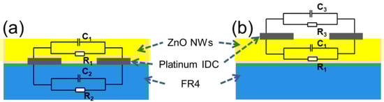 Comparing the two sensor structures, the equivalent circuit diagrams are shown (Figure 6). In the general structure (Figure 6a), and represent the leakage resistances of the IDC, while denotes the parallel resistance of and . Additionally, refers to the total capacitance of and arranged in parallel. In comparison, in this work (Figure 6b), and are the leakage resistances of the IDC, while represents the parallel resistance of and . Furthermore, corresponds to the total capacitance of and arranged in parallel. Herein, and , and , and and represent the equivalent resistance and capacitance of gas sensing material, substrate, and free space, respectively. They are discussed as the main variation parameters. In practical application, and of the gas sensing material will alter with changes in gas concentration. As for and , they will change due to the differences in the substrate, and will also change because of variations in gas adsorption by the substrate. However, and change as the gas atmosphere alters, but the change is relatively minor. Equations (4)–(7) reveal that, for the general coating method (Figure 6a), changes in the substrate and during the testing process will interfere with the alteration of , thereby potentially affecting test results. In contrast, the structure utilized in this work (Figure 6b) involves the upper surface of the IDC contacting the surrounding air. As a result, and remain nearly unchanged, thus eliminating interference from the substrate.