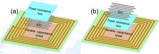 Verification was conducted via HFSS software simulation. A fixed resistance ‘box’ was employed to simulate the gas sensing material. It was separately placed above and below the IDC to build the two different structures. Additionally, a variable capacitance ‘sheet’ was positioned above the substrate to replicate alterations in , with a change range set between 3.5–4.5 pF (Figure 7). The thickness of the ‘box’ is 100 μm and the ‘sheet’ is thickness-free. Simulation was executed to observe both the parameter of the sensor antenna and the change in resonant frequency using the curve.