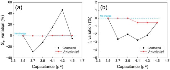 The variation of and of the sensor with two different structures is shown (Figure 8). For clarity, and values extracted at a capacitance of 3.5 are selected as initial values ( and ). Equations (8) and (9) express the changes in and , denoted as and , respectively. It is noteworthy that the (Figure 8a) and (Figure 8b) values of the LC sensor, utilizing the proposed sensor structure, exhibit minimal sensitivity to changes in substrate capacitance of .