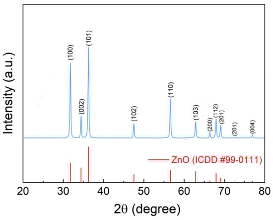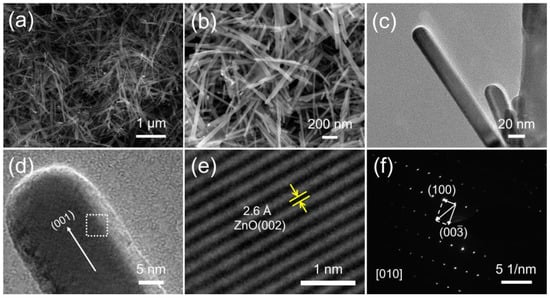 The XRD pattern of the as-synthesized sample (Figure 9) indicated that the obtained samples are high purity ZnO with a hexagonal wurtzite structure (ICDD #99-0111) []. The as-prepared sample was observed by SEM and TEM (Figure 10). The ZnO samples exhibit a uniform and wire shape with smooth and non-branched surfaces and excellent dispersion (Figure 10a–c). The ZnO products display a narrow diameter distribution, ranging from 20–50 nm. Additionally, for a single ZnO NW, the diameter displays hardly any variation along the long axis. The length distribution of the ZnO NWs is slightly wider, ranging from 500 nm to a few micrometers. The excellent crystallinity of the synthesized ZnO NWs is evident from the clear diffraction fringe observed (Figure 10e), where the interplanar spacing between adjacent fringe is 2.6 Å. Based on the XRD results, it is determined that this spacing corresponds to the (002) crystal plane of the hexagonal fibrillated ZnO structure. This result indicates that the ZnO NWs are formed by the growth of ZnO grains along the c-axis direction (Figure 10d) []. Furthermore, the SAED pattern of the ZnO NWs (Figure 10f) displays a distinct diffraction dot pattern, providing evidence for the single-crystal nature of the as-prepared ZnO NWs.