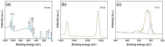 The XPS analysis results of the ZnO NWs is shown (Figure 11). The full spectrum scan (Figure 11a), indicating the presence of spectral peaks for Zn, O, and C elements only, further confirms the high purity of the ZnO NWs. The high-resolution spectrum of Zn 2p (Figure 11b) reveals two distinct characteristic peaks. The peak at a binding energy of approximately 1021.27 eV corresponds to Zn 2p3/2, while the peak at a binding energy of about 1044.33 eV corresponds to Zn 2p1/2, with an energy interval of approximately 23 eV between them. This indicates that the element Zn in the ZnO NWs exists in the +2 valence form []. In the high-resolution spectrum of O 1s (Figure 11c), the observed peak at a binding energy of approximately 530.02 eV is caused by lattice oxygen in ZnO crystals. Additionally, the peaks at binding energies of around 531.04 eV and 536.04 eV are primarily associated with adsorbed oxygen on the material surface, as well as oxygen vacancies [,].