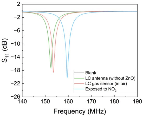 According to the electrical model presented in previous reports, by analyzing the and data acquired from the reader antenna, it is possible to infer changes in the surrounding environment. The curves of the substrate alone, the LC antenna, and the LC gas sensor in both air and NO2 environments at an operating temperature of 180 °C are measured (Figure 12). A pronounced decline in and amplitude can be observed when comparing the LC gas sensor to the LC antenna, both in air. This is attributable to the fact that ZnO possesses higher dielectric constant and conductivity values compared to those of air. The coating of ZnO on the IDC leads to an increase in its capacitance and a decrease in its leakage resistance. In comparison to the sensor in air, the and magnitudes of the sensor increase following exposure to NO2. This increase is primarily attributed to the adsorption of NO2 on the ZnO NWs, which subsequently changes the input impedance of the circuit and thereby modifies the and . Moreover, it is evident that the of the LC sensor exhibits a measurement value of less than −10 dB both before and after exposure to NO2. This observation further confirms the high energy and information transfer efficiency of the LC gas sensor with the reader antenna.