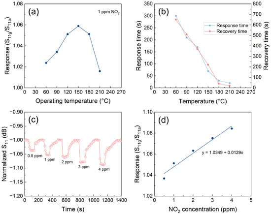 A schematic diagram of the wireless gas sensing measurement setup is shown (Figure 3a). The LC gas sensor was positioned on a temperature-controlled heating table within a sealed gas chamber, while an external reader antenna was connected to a VNA (AV3656D) and placed parallel to the sensor at around 5 mm. This configuration enabled precise measurement and analysis of the sensor’s response to the presence of NO2 gas. Subsequently, the network analyzer is used to analyze the information collected by the reader antenna. Measurements of the and corresponding frequency () were recorded at regular 10-s intervals. The response of the LC sensor was determined as 11g/11a, in which 11a and 11g represent the of the LC sensor in air and in NO2, respectively (Figure 3b). The determination of the response and recovery times of the sensor involves measuring the duration needed for a 90% alteration in the fully normalized amplitude. To compare responses, all measured were divided by the initial magnitude, resulting in a “normalized ” that started from −1.0. This approach ensured that all baselines originated at the same value, irrespective of any added mass attributable to the sensitive layer [].
