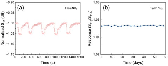 Given their passive property, the LC gas sensors are highly suitable for use in scenarios where battery replacement is impractical or difficult. However, this feature also presents a challenge to the stability of such sensors, as their reliability and long-term performance must be maintained without the benefit of regular power source maintenance. The response–recovery curves of the LC sensor to 1 ppm NO2 at 180 °C over five consecutive tests are shown (Figure 14a). The sensor exhibits consistent response–recovery characteristics across each test cycle. Furthermore, the S11 parameter of the sensor can revert to its initial value after each test, indicating an excellent reversibility, repeatability, and stability. To further assess the stability of the sensor over a longer time, the changes in sensor response to 1 ppm NO2 over a 60-day timeframe were recorded (Figure 14b). Notably, only minor fluctuations are observed in the response of the sensor over this extended period, underscoring its exceptional stability for detecting NO2 at 180 °C.