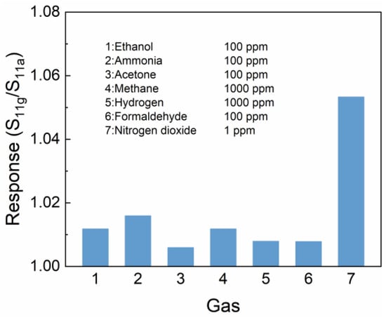 To further investigate the selectivity of LC sensors for different kinds of gases, the responses of the sensor towards different gases are evaluated at the optimal operating temperature. The response of the LC sensor towards NO2 at 180 °C is significantly higher than that of other tested gases (Figure 15), indicating exceptional NO2 selectivity of the developed LC gas sensor.