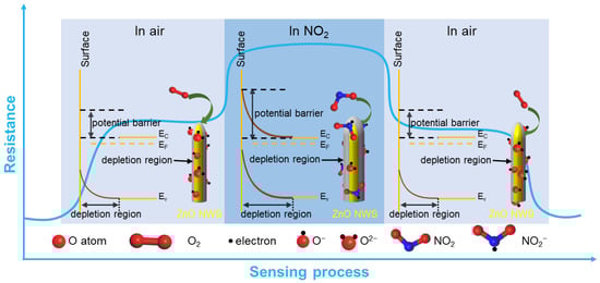 The gas sensing mechanism of the LC gas sensor to NO2 is briefly described (Figure 16). When the sensor is in air, a significant number of oxygen molecules are adsorbed on the surface of ZnO NWs in the form of chemisorbed oxygen of , , or [,]. These adsorbed oxygen species trap electrons from the conduction band of the ZnO NWs, resulting in the formation of an electron depletion layer on the ZnO surface and a subsequent decrease in carrier concentration. As a result of these changes, the resistance of the material increases, with the corresponding chemical reaction equations shown in Equations (10)–(13) [,].