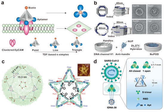 The algebraic topology of biomolecules can be arranged on a DNA framework to match the receptor patterns on the cell surface. Fan’s group topologically rearranged 1–3 aptamers on a DNA tetrahedral framework including point, line, and surface configurations, targeting overexpressed epithelial cell adhesion molecule (EpCAM) on tumor cell membranes. The multivalent ligands distributed in a surface pattern showed the strongest ability to recruit receptor aggregation on the cell membrane, with a 19-fold increase in affinity compared to free aptamers [79] (Figure 4a). By utilizing DNA tetrahedral dimers, researchers were able to broaden the topological configurations of the aptamers. This expansion resulted in altered molecular recognition properties and binding strength by inducing receptor aggregation on the cell membrane [80]. Shen and colleagues built a suite of nuclear pore complex (NPC) mimics by programmably arranging multiple nucleoporin proteins on DNA origami. They designed two octagonal-shaped DNA origami channels to mimic the NPC’s eightfold rotational symmetry. Different numbers of nucleoporin proteins formed different topologies in the structure and showed different binding affinity to the capsid of human immunodeficiency virus 1 (HIV-1), which provides a mechanistic insight for elucidating how viruses enter the nucleus [81] (Figure 4b).
