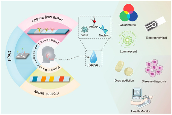 There have been several reviews on saliva sensors [32,33,34]. However, these reviews are mainly specific to a particular assay [35] or disease [36]. Meanwhile, in the study of paper-based sensors and biosensors, no reviews focus on saliva detection [37]. Therefore, the current review summarizes the current state of biosensor research combined with saliva analysis (Figure 1). However, most of these devices have been successfully tested in the laboratory and are expected to be used commercially.