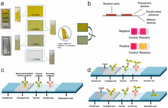 The strategies of LFA can be divided into two types: sandwich LFA and competitive LFA. In summary, sandwich LFAs are preferably implemented for analytes with large molecules or multiple binding sites like protein. Specific nucleic acids or antibodies coat with the Test and Control lines, respectively [43]. If the sample contains targets, the signal of both lines will change, and if not, just the C line changes its signal (Figure 2d).