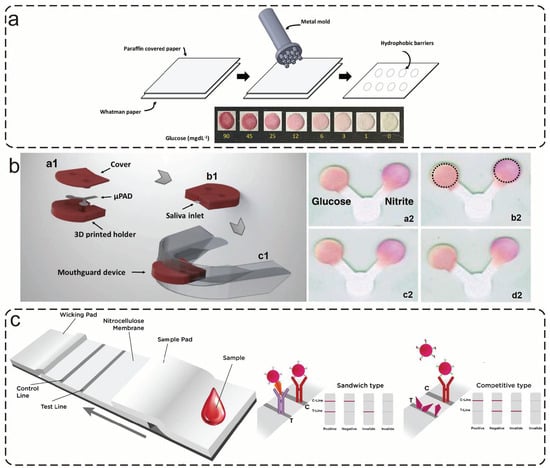 Diabetes mellitus is a chronic metabolic syndrome that can lead to multiple complications. Glucose measurements are critical to the prevention and treatment of diabetes [120,121]. Santana–Jiménez et al. demonstrated a paper-based platform to detect glucose (Figure 10a) [122]. They used a stamping process to limit circular detection zones and modified it with chitosan to satisfy the best detection condition. Glucose was catalyzed by the GOx enzyme hydrogen peroxide (H2O2). Then the released H2O2 changed f4-APP/TBHBA chromophore from colorless to a purple-colored product. The device showed good performance as a semi-quantitative method. Wearable sensors have acquired extensive attention in recent decades. Particularly, there is a growing interest in developing various wearable health-monitor sensors, especially for people with reduced mobility [123]. For healthcare monitoring, wearable devices have been used to detect variable biomarkers. De Castro et al. first integrated μPADs into silicone mouthguards to develop paper-based wearable sensors (Figure 10b) [124]. Using a 3D-printed holder encloses the μPAD into the mouthguard for wearable paper-based devices. A colorimetric assay was carried out to detect glucose and nitrite., The nitrite concentrations were considerably higher for the periodontitis patients than for healthy. Moreover, diabetes and periodontitis have a two-way relationship, so monitoring both analytes may be helpful for a more complete diagnosis which is of paramount importance. This wearable device opens new horizons for paper-based platforms to produce simple, low-cost wearable sensors.