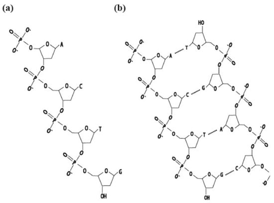 The double strand is constituted from two single-stranded DNAs (ss-DNAs). The ss-DNAs hybridize in a complementary way through hydrogen bonds [44]. The double-stranded DNA (dsDNA) forms a double helix through the bonding of two complementary bases of adenine with thymine (A–T pair) and guanine with cytosine (C–T pair) (Figure 2). It has a 5′-3′ polarity, representing the sequence direction of nucleic acid synthesis. The pentose sugar ring of the nucleotide has a phosphate group at its end attached to the 5′ carbon of the deoxyribose ring and has an unmodified 3′ end from deoxyribose-OH substituent.