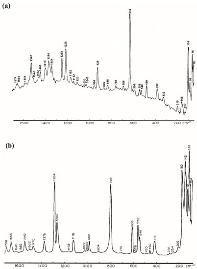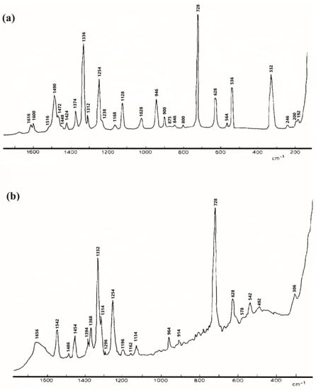 Spectra of adenine in a solid state (Figure 3) and in solution exhibited intense bands at 728 cm−1 and in the region 1400–1200 cm−1. They assigned the 728 cm−1 band to the (C-C)/(C-N) in-phase stretching modes, the 1254 cm−1 to the (C-NH2) stretching mode, the 1332 cm−1 to the (C-N) and (C=N) stretching modes and the 1368 cm−1 to the (C8-H) and (C2-H) out-of-plane bending modes [48]. For the adenine in solution (Figure 3b), similar bands were observed with some shifts and shape modifications.