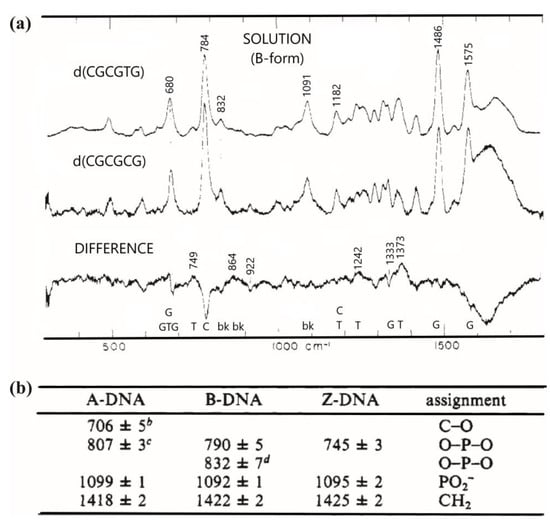 (a) Raman spectra of DNA in B form in solution between the range 300 and 1800 cm−1 of B-DNA. d(CGCGTG) in the top, d(CGCGCG) in the middle and the spectrum of d(CGCGTG) minus d(CGCGCG) showing the computed difference down. Label of “bk” here represents OPO groups of the B-DNA backbone and A, C, G or T, corresponding to the bands of the nucleosides; (b) the table showing the mode frequencies in cm−1 extracted from Raman spectra of known structure of DNA crystals [from Thomas and Wang (1988)] (adapted with permission from [58]).