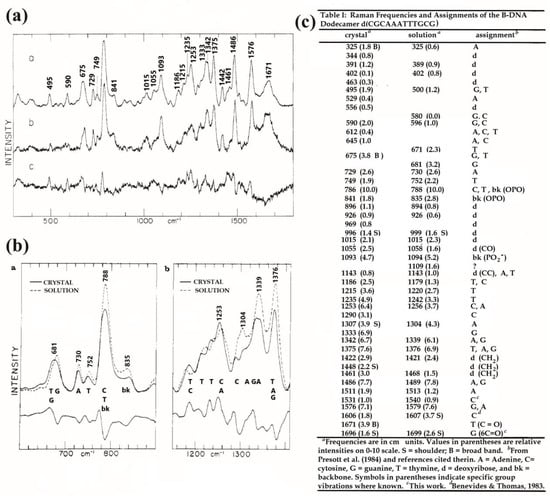 (a) Raman spectra of the oligonucleotide d(CGCAAATTTGCG) in B-form (1): spectrum in crystal a, in solution b, and difference c between a and b; (b) comparison of the Raman spectra of the oligonucleotide d(CGCAAATTTGCG) in B-form in crystal and in solution; (c) table showing the frequencies in cm−1 corresponding to the peak positions of different B-DNA Raman bands. A, C, G and T correspond to the bands of the bases and the backbone groups bk to OPO, P, etc., extracted from earlier studies on mono-oligonucleotides and poly-oligonucleotides [referred from Thomas et al. (1986)] (adapted with permission from [59]).
