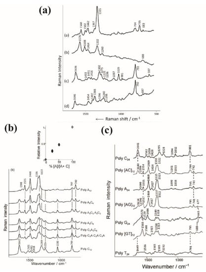 - Thomas, G.J.; Wang, A.H.J. Laser Raman Spectroscopy of Nucleic Acids. In Nucleic Acids and Molecular Biology; Eckstein, F., Lilley, D.M.J., Eds.; Springer: Berlin/Heidelberg, Germany, 1988; Volume 2. [Google Scholar] [CrossRef]