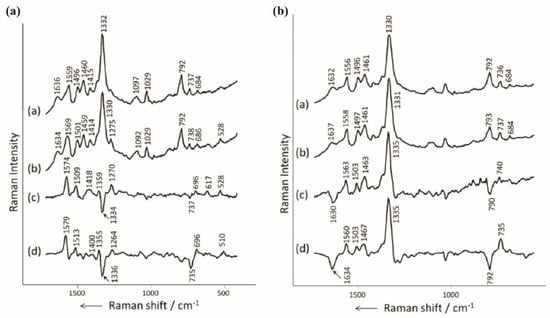 In order to understand the Raman spectrum of the B-form DNA and to compare it with the spectra of the two other forms (A and Z), Benevides et al. studied the oligonucleotide d(CGCAAATTTGCG) that crystallizes in B-form. To obtain DNA in solution, the oligonucleotide was dissolved in NaCl buffer solution. The samples were excited with a 514.5 nm laser (200–300 mW). In solution, the spectrum was different from the one of the crystal (Figure 8). Most of the spectral differences were observed in the 600–900 and 1200–1400 cm−1 ranges. These ranges are sensitive to the fingerprints of the nucleoside [59].
