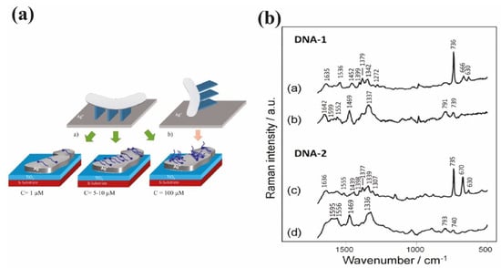 - He, L.; Langlet, M.; Bouvier, P.; Calers, C.; Pradier, C.-M.; Stambouli, V. New Insights into Surface-Enhanced Raman Spectroscopy Label-Free Detection of DNA on Ag/TiO2 Substrate. J. Phys. Chem. C 2014, 118, 25658–25670. [Google Scholar] [CrossRef]