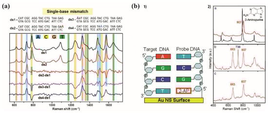 - Xu, L.-J.; Lei, Z.-C.; Li, J.; Zong, C.; Yang, C.J.; Ren, B. Label-Free Surface-Enhanced Raman Spectroscopy Detection of DNA with Single-Base Sensitivity. J. Am. Chem. Soc. 2015, 137, 5149–5154. Available online: https://pubs.acs.org/doi/abs/10.1021/jacs.5b01426 (accessed on 17 March 2020). [CrossRef] [PubMed]