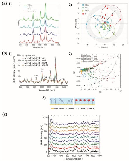 - Yasukuni, R.; Gillibert, R.; Triba, M.N.; Grinyte, R.; Pavlov, V.; Chapelle, M.L. de la Quantitative Analysis of SERS Spectra of MnSOD over Fluctuated Aptamer Signals Using Multivariate Statistics. Nanophotonics 2019, 8, 1477–1483. [Google Scholar] [CrossRef]