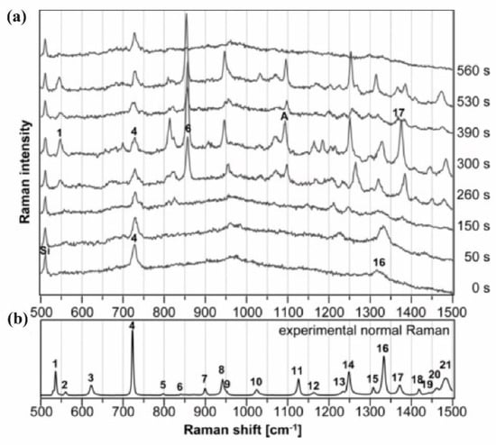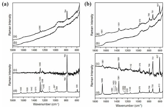 Thornton et al. studied different nucleic acids (adenine and guanine) in liquid conditions. The solutions were prepared at a concentration of 5.0 mM with buffer (pH between 4 and 7.5) and mixed with silver colloidal nanoparticles [61]. The samples were excited with a 514.5 nm excitation wavelength (100–200 mW). The most intense band was observed at 735 cm−1 and corresponded to the ring breathing mode of adenine. We can note that this mode was red-shifted compared with the one observed in classical Raman (726–728 cm−1, Section 4.1.1) [48]. When adenine was present in an equimolar mixture of different bases (adenine, cytosine and uracil), adenine bands dominated the spectrum. SERS experiments implied that the compounds that showed the highest enhancement were the ones that were preferentially adsorbed on the active sites of the metallic surface [62]. The surface may favor the adsorption of the adenine compared with the other bases.