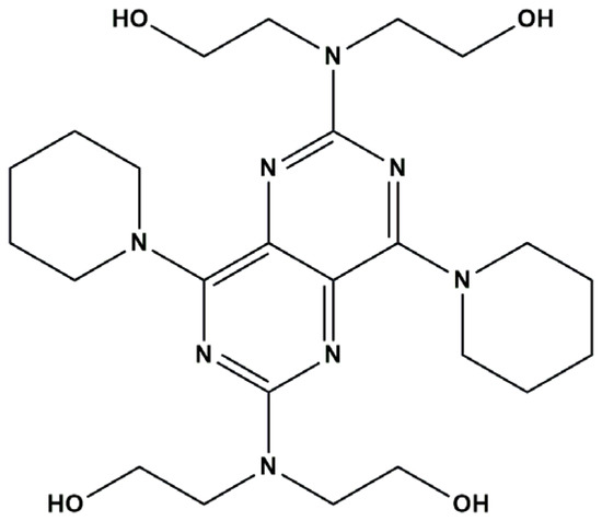 Dipyridamole (DIP), 2,6-bis-(diethanolamino)-4,8-dipiperinopyrimido [5,4-d] pyrimidine (Figure 1) is one of the most prescribed antithrombotic drugs administered orally. It was first introduced in 1959 as a coronary vasodilator and anti-anginal agent, and it was prescribed for myocardial infarction prevention, post-coronary angioplasty, and artery bypass surgery. It was demonstrated that, when it is administered in addition to aspirin, it can induce an augmentation of platelet-inhibiting action due to a pharmacokinetic interaction between them [1]. Unfortunately, despite this drug’s benefits, it also shows some inconveniences, such as inducing coronary ischemia when it is administered intravenously, and some side effects, such as chest tightness, dizziness, abdominal pain, and headache [2].