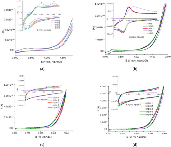 In order to obtain the MIP_PGE, electropolymerization of CA (monomer) in the presence of DIP (template) in PBS pH = 7.00 (supporting electrolyte) at the PGE surface was carried out by applying five potential cycles between 0.000 and 2.000 V (Figure 2a). The NIP_PGE was prepared in the same conditions but in the absence of DIP (Figure 2b). In the direct scan of the first voltammetric cycle recorded for obtaining the MIP_PGE (Figure 2a), one can observe two anodic signals at cca. 0.300 V (peak a) and at cca. 0.500 V (peak b), respectively. Comparing the voltammograms recorded for the monomer–template mixture (Figure 2a) with those obtained for each individual component (Figure 2b,c), the peak situated at less positive potentials (peak a) can be attributed to the CA oxidation, while the signal from about 0.500 V (peak b) corresponded to DIP anodic process at cca. 0.300 V and cca. 0.500 V, respectively. During the reversed scan, even of the first cycle, a cathodic peak appeared at cca. 0.150 V (Figure 2a). Starting with the second scan, these two peaks decreased dramatically, the DIP signal (b) (Figure 2a,c) disappearing totally starting with the third scan, while peak (a) shifted toward less positive potentials (Figure 2a,b). Moreover, according to Nian Bing Le et al. [24], the signal from cca. 0.230 V can be attributed to the formation of the poly (caffeic acid) (pCA) film. On the other hand, peak (a) formed a redox couple with the cathodic one, which corresponded to the o-quinone/o-hydroquinone pair that sustained the formation of pCA film [25,26]. The enhancement of the currents of these two peaks with increasing cycle numbers suggested that a conducting polymer was generated at the electrode surface. A recent paper reported the formation of the pCA film at a carbon-based electrode (namely, a glassy carbon electrode) applying high voltages, and the existence of the polymeric film was confirmed by FTIR analysis [27].