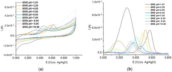 Cyclic (scan rate 0.100 V/s) (a) and differential pulse voltammograms (b) recorded at MIP_PGE for solutions of 5.00 × 10−5 mol/L DIP in BRB solutions with different pH values.