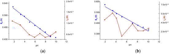 The potential of the DIP oxidation peak (Ep) became less positive when the solution pH increased due to the involvement of protons in the corresponding electrode process. The slopes of the regression equations Ep = −0.02678 × pH + 0.658 (R2 = 0.99301) and Ep = −0.02812 × pH + 0.60468 (R2 = 0.97218) for CV (Figure 5a) and DPV (Figure 5b), respectively, describing the Ep = f (pH) dependencies, were close to half of the theoretical value given by the Nernst relation, suggesting that the ratio between the number of protons and the number of electrons participating in DIP electro-oxidation was ½. This observation was in accordance with the data previously reported for the DIP electrode process at bare PGE [30].