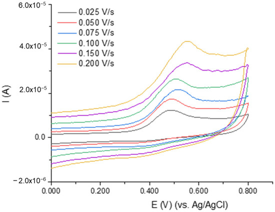 Cyclic voltammograms recorded at the MIP_PGE for 1.50 × 10−4 mol/L DIP in PBS pH = 7.00 at different scan rates.