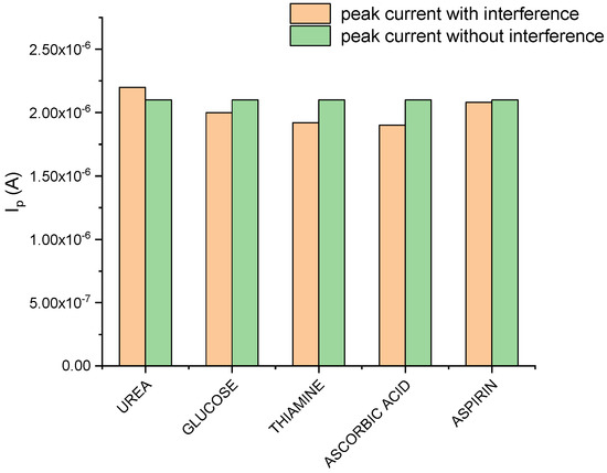 The DIP response at MIP_PGE was investigated in the presence of other biologically important compounds, such as urea, glucose, thiamine, ascorbic acid, and aspirin, at an analyte (1.00 × 10−6 mol/L) to interfering species (1.00 × 10−5 mol/L) concentration ratio of 1:10 (Figure 9). From all tested compounds; only urea presented a small anodic peak at cca. 0.090 V, with a peak current of about 5 × 10−7 A.