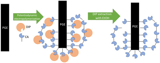 Electropolymerization of CA (monomer) in the presence of DIP (template) on the PGE surface was carried out potentiodynamically in PBS pH = 7.00 applying 5 potential cycles in the potential range from 0.000 to 2.000 V at a scan rate of 0.100 V/s. In order to obtain the MIP_PGE, the template (DIP) was removed from the poly (caffeic acid) (pCA) film deposited at the PGE by extraction for 2 h in ethanol (Scheme 1). The complete elimination of the DIP from the polymeric matrix was confirmed by the absence of the DIP characteristic oxidation signal recorded by DPV in the supporting electrolyte (PBS pH = 7.00). For comparison, a non-imprinted poly (caffeic acid) modified PGE (NIP_PGE) was prepared by CA polymerization in the absence of DIP using the same conditions as presented above.