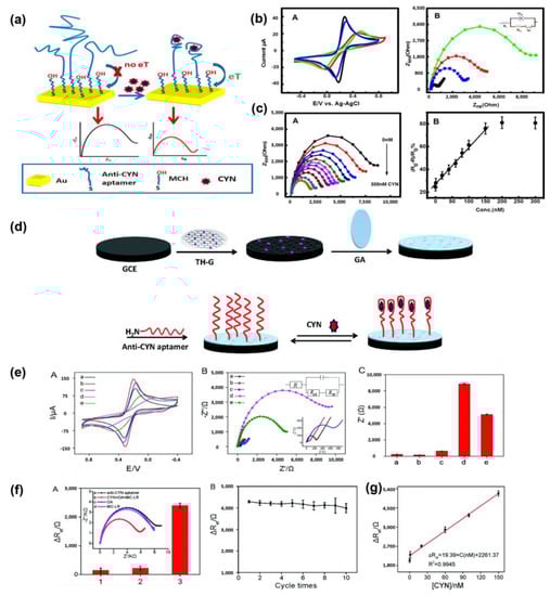 (a) Schematic diagram of fabrication of label-free electrochemical aptasensor for detecting CYN. (b) (A) Cyclic voltammograms measured at a scan rate of 100 mV/s for each sensor manufacturing process. (B) Nyquist plot for each manufacturing process of the sensor (105~3 Hz, 0.21 V DC potential and 5 mV AC amplitude) Curves according to Au, Au/CYN9, Au/CYN9/MCH and Au/CYN9/MCH/CYN (60 nM) are black, red, blue and green curves. (c) (A) Nyquist plots of sensors measured at CYN concentrations of 0, 0.1, 1.0, 20, 40, 60, 80, 100, 150, 200, and 300 nM. (B) Linear regression curve with the result of A corrected by ΔR/Ro%. Reproduced with permission from Ref. []. Copyright 2014 American Chemical Society. (d) Schematic diagram of label-free CYN detection aptasensor fabricated through covalent bonding of TH-G (thio-nine-graphene) nanocomposite modified electrode and ami-no-substituted CYN aptamer. (e) (A) Cyclic voltammogram and (B) Nyquist plot and equivalent circuit for each stage of the sensor manufacturing process (a. bare GCE (black), b. GCE/TH-G (red), c. GCE/TH-G/GA (blue), d. GCE/TH-G/GA/anti-CYN aptamer (purple) and e. GCE/TH-G/GA/anti-CYN aptamer/80 nM CYN (green)). (C) Electron transfer resistance for (A). (f) (A) Selectivity of aptamersensors through impedance measurement of Okada acid (OA) and Microcystin-LR (MC-LR) (B) ΔRet value change according to sensor reuse cycle (g) ΔRet linear regression curve for EIS measurements by concentration of CYN. Reproduced with permission from Ref. []. Copyright 2015 Royal Society of Chemistry.