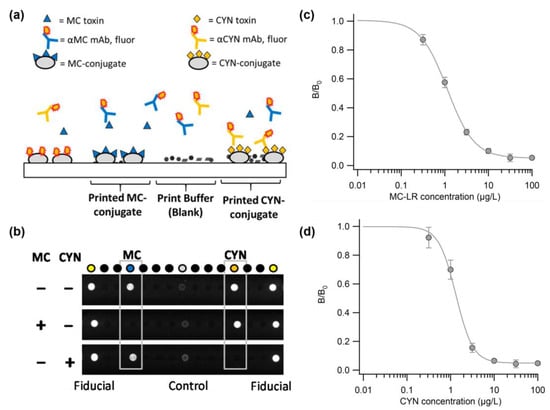 (a) Schematic of competitive immunoassay array for CYN and MC. (b) Representative images of immunoassay arrays in MC (blue) and CYN(orange) under various conditions. Another arrangement is a print buffer blank and fluid control unit. (c) Standard curve for analysis by concentration of diluted MC-LR. (d) Standard curve for analysis by concentration of diluted CYN. Reproduced with permission from Ref. []. Copyright 2018 American Chemical Society.