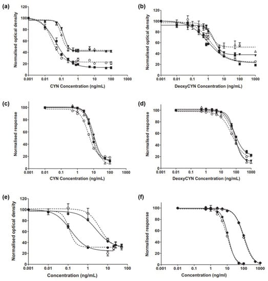(a) Calibration curves for polyclonal antibodies determined by ELISA for (a) CYN and (b) deoxyCYN and by SPR for (c) CYN and (d) deoxyCYN (○ Polyclonal 1; ■ Polyclonal 2; △ Polyclonal 3; ▼ Polyclonal 4) Calibration curves for monoclonal antibodies determined by (e) ELISA and (f) SPR for CYN and deoxyCYN (○ CYN monoclonal 1; ◇ deoxyCYN monoclonal 1; ● CYN monoclonal 2; ◆ deoxyCYN monoclonal 2) Reproduced with permission from Ref. []. Copyright 2013 Elsevier.