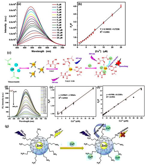 (a) Fluorescence spectra of NALC-CdS QDs with different concentrations of Cu2+ in aqueous solution, (b) the relationship between the relative fluorescence intensity (F0/F) and the concentration of Cu2+, and (c) schematic of the quenching mechanism of NALC-CdS QDs by Cu2+. Reprinted with permission from ref. [61]; Copyright IOP Publishing. (d) Fluorescence spectra of the NH2-ZnO QDs with different concentrations of Cu2+ in aqueous solution; (e,f) the linear relation curves of F0/F and the concentration of Cu2+: (e) 2–20 nM; (f) 1–100 μM. (g) Schematic of quenching mechanism of NH2-ZnO QDs by Cu2+. Reprinted with permission from ref. [63]; Copyright 2020 Elsevier.