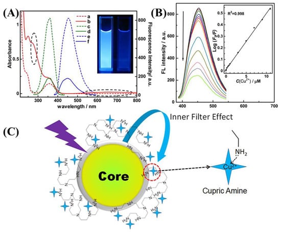 (A) UV-vis spectra (a, b) and FL spectra (excitation spectra, c, d; emission spectra, e, f) of BPEI-CQD solution in the absence (a, c, e) and presence (b, d, f) of 150 μM Cu2+ ions. The inset shows photos of BPEI-CQD solutions in the absence (left) and presence (right) of Cu2+ under UV light of 365 nm. (B) FL response of BPEI-CQDs upon addition of various concentrations of copper ions. Inset: Linear relationship between F0/F of BPEI-CQDs and the concentration of Cu2+. (C) Schematic diagram of the fluorescence quenching of the BPEI-CQDs by Cu2+. Reprinted with permission from ref. [66]; Copyright IOP Publishing.