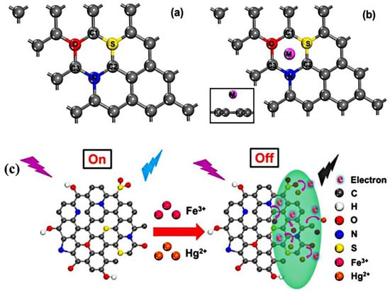 The top views of density functional theory (DFT) simulation mode for (a) N, S-GQDs and (b) M cations (M = Fe3+, Hg2+) adsorbed on the surface of N, S-GQDs. (c) Schematic diagram of N, S-GQDs as a fluorescence probe. Reprinted with permission from ref. [90].