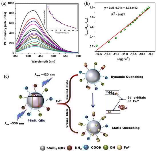 (a) PL intensity of QDs in the presence of Fe3+ ions. (b) The linear relationship between the fluorescence intensity and Fe3+. (c) Schematic diagram for static and dynamic quenching of f-SnS2 QDs by Fe3+ ions. Reprinted with permission from ref. [104]. Copyright 2020 Elsevier.