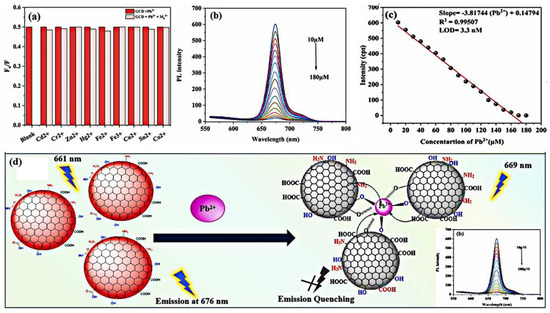 Babu et al. [125] synthesized CQDs from Delonix regia that were also applied in the construction of Pb2+ sensors. The developed sensors for Pb2+ detection showed an LOD of 3.3 nM within the linear response range of 10–180 µM (Figure 5a–c). The mechanisms of this sensor are shown in Figure 5d. With this sensor, the fluorescence quenching of CQDs is largely due to FRET between the CQDs and Pb2+. Herein, Pb2+ acts as a non-fluorescent acceptor, and CQDs act as a donor fluorophore. In addition, Pb2+ is prone to be adsorbed on the surfaces of CQDs to form a non-fluorescent complex due to electrostatic interactions between CQDs and Pb2+. The formation of non-fluorescent complexes also leads to the fluorescence quenching of CQDs. Additionally, the sensor was studied for its applications in tap, river, and lake waters with recovery values of 99–101%. Likewise, the proposed sensor was also used in industrial effluents, yielding recovery rates of 98–100%. As a result, the proposed sensor exhibited great potential in environmental monitoring.