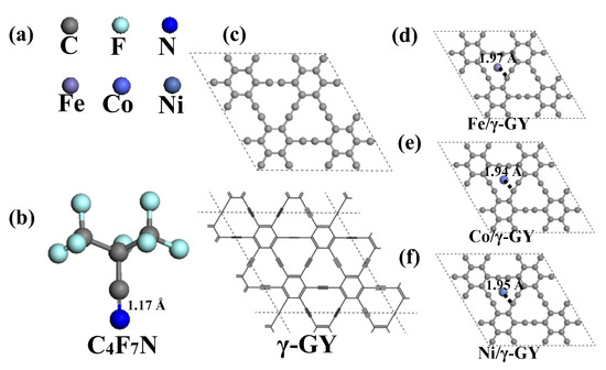 Geometric structures of C4F7N, pristine γ-GY, and 3d VIII atom-decorated γ-GY: (a) atom specification; (b) C4F7N; (c) pristine γ-GY; (d) Fe/γ-GY; (e) Co/γ-GY; (f) Ni/γ-GY.