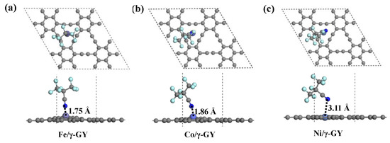 Adsorption structures of C4F7N on 3d VIII atom-decorated γ-GY: (a) Fe/γ-GY; (b) Co/γ-GY; (c) Ni/γ-GY.