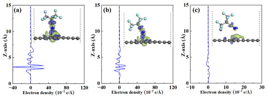 CDD is a useful method for analyzing the charge distribution before and after gas adsorption [40]. To further investigate the electron transfer, CDD configurations are calculated and presented in Figure 3. Since chemisorption on the Fe and Co site is more pronounced, the isosurface value is set to 0.01 e/Å3, while for Ni/γ-GY, this value is only 0.002 e/Å3. In the case of Fe/γ-GY, the region between the Fe and N atoms exhibits an encapsulated structure with electron depletion at the center and accumulation surrounding it. The maximum absolute electron density along the Z-axis can reach 40 e/Å3. Therefore, even though the electron transfer value is small, there is a significant redistribution of the electron cloud for Fe/γ-GY after C4F7N adsorption. It is important to note that the Hirshfeld analysis is based on electron density [33], and while chemisorption can result in an obvious redistribution of the electron cloud, it may not necessarily lead to a numerical electric charge. In the case of adsorption on Co/γ-GY, by comparing the maximum value of electron density change, the absolute peak value is only about 15 e/Å3, indicating a weaker degree of redistribution compared to Fe/γ-GY. Regarding Ni/γ-GY, the redistribution is much less noticeable due to the flat curve shown in Figure 3b. Therefore, stronger adsorption strength leads to more pronounced electron redistribution, but the redistribution is not directly related to the value of electron transfer.