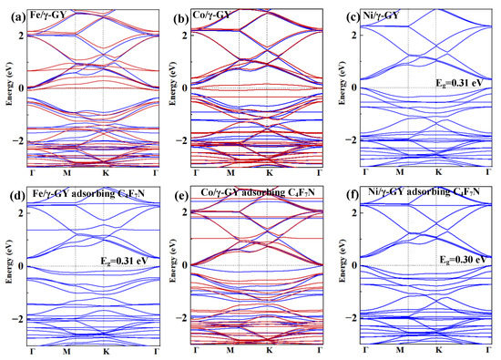 Band structures of 3d VIII atom-decorated γ-GY before and after adsorbing C4F7N: (a) Fe/γ-GY before adsorption; (b) Co/γ-GY before adsorption; (c) Ni/γ-GY before adsorption; (d) Fe/γ-GY after adsorption; (e) Co/γ-GY after adsorption; (f) Ni/γ-GY after adsorption. (If the system has magnetic moment, the blue and red lines denote the spin-up and spin-down bands, respectively.)