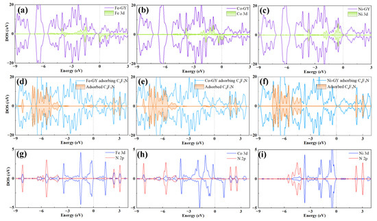DOS of 3d VIII atom-decorated γ-GY before and after adsorbing C4F7N: (a) Fe/γ-GY before adsorption; (b) Co/γ-GY before adsorption; (c) Ni/γ-GY before adsorption (the purple lines are the TDOS of TM/γ-GY before adsorption, and the green shade is the TM 3d orbitals); (d) Fe/γ-GY after adsorption; (e) Co/γ-GY after adsorption; (f) Ni/γ-GY after adsorption (the blue lines are the TDOS of TM/γ-GY after adsorption, and the orange shade is the PDOS of adsorbed C4F7N); (g) Fe 3d and N 2p orbitals; (h) Co 3d and N 2p orbitals; (i) Ni 3d and N 2p orbitals.