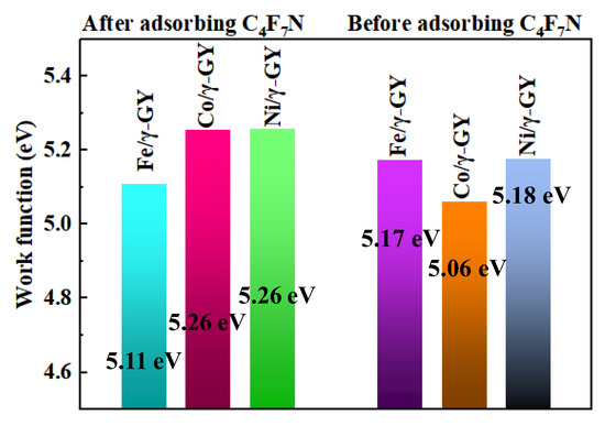 where Φ is the work function, U(∞) and EF are the electrostatic potentials at the vacuum level and the Fermi energy of the sensing material. The traditional method to measure the work function is through Kelvin probe measurements. However, due to the inconvenience of the equipment and the complexity of operations, an alternative and feasible method to determine the work function change is by using metal–insulator–semiconductor (MIS) capacitors. The work function value is highly related to the drain current of the field effect transistors (FET) of MIS [44,45]. The work function values of different TM/γ-GY before and after C4F7N adsorption are shown in Figure 6. Prior to adsorption, the work functions of Fe/γ-GY, Co/γ-GY, and Ni/γ-GY are 5.17 eV, 5.06 eV, and 5.18 eV, respectively. After C4F7N adsorption, Co/γ-GY experiences the maximum increase in work function to 5.26 eV, indicating the highest response with the same adsorbing capacity. Fe/γ-GY and Ni/γ-GY exhibit smaller changes in work function, with values of 0.06 eV and 0.08 eV, respectively, indicating a lower response. Hence, if TM/γ-GY is utilized as an MIS-based work function-type gas sensor, Co/γ-GY is the most suitable sensing material for detecting C4F7N.