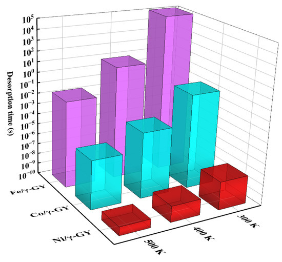 where A and Eads are the apparent frequency and adsorption energy. The value of A is approximated to be 1012 s−1 [47,48]. The desorption time evaluation of C4F7N on TM/γ-GY at different temperature are shown in Figure 7.
