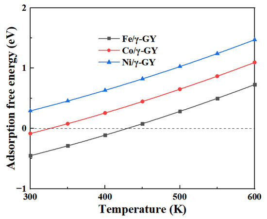 The relationship between temperature (300 K to 600 K) and adsorption free energy is shown in Figure 8. As the temperature increases, the adsorption free energy also increases. If the value of ΔGad is smaller than 0, the adsorption of C4F7N can be considered a spontaneous process. As shown in Figure 8, the intersection point of Fe/γ-GY at 0 eV is approximately 430 K, while for Co/γ-GY, it is around 330 K. On the other hand, the adsorption of Ni/γ-GY cannot occur spontaneously at room temperature. Therefore, the working temperature of TM/γ-GY should not exceed the temperature at which the adsorption process becomes spontaneous. These analyses indicate the need to evaluate the working temperature of TM/γ-GY-based gas sensors.