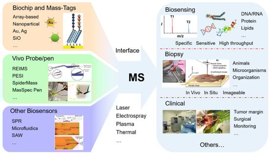 Schematic representation of different sensing technologies (biochip [], in vivo probe [,], microfluidic [], etc.) combined with mass spectrometry for different detection scenarios (biopsy [], clinical [], etc.). Copyright with permission from Wiley, Royal Society of Chemistry, American Chemical Society.