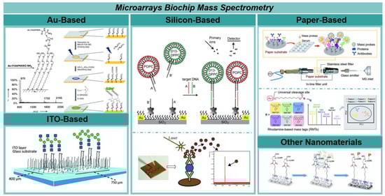In addition to microarray biochip mass spectrometry (Figure 2), the development of nanomaterials has contributed to the refinement of mass spectrometry sensing techniques These techniques currently utilize nanomaterials directly or small molecules as mass tags and are categorized as nanomaterial-based mass tags (MT) mass spectrometry. Several nanomaterials, including AuNPs, AgNPs, PtNPs [,,], quantum dots [], and metal nanoclusters, can be effectively bound to specific biological moieties. This capability enables the targeted labeling of biomolecules, allowing in situ multiplexed mass spectrometry analysis of proteins [], glycans [], and other biomolecules [] within biological systems [,,]. It should be noted that Min’s team has recently provided an exhaustive review on the topic of MT-encoded MS [], thus this review will not delve into the field in greater depth.